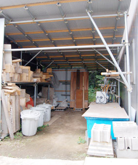 差し掛けスペースは寄せ木材や、彫塑板など、普段アトリエの中に置いておくと邪魔なものを置く場所として使用しています。